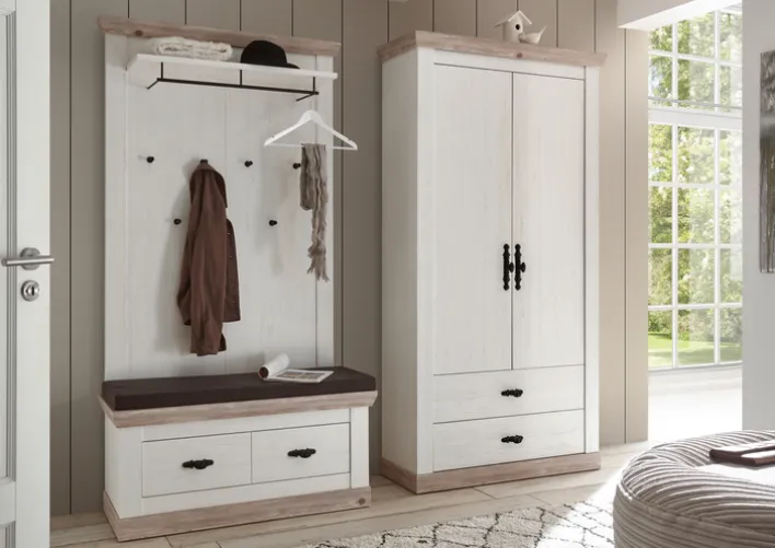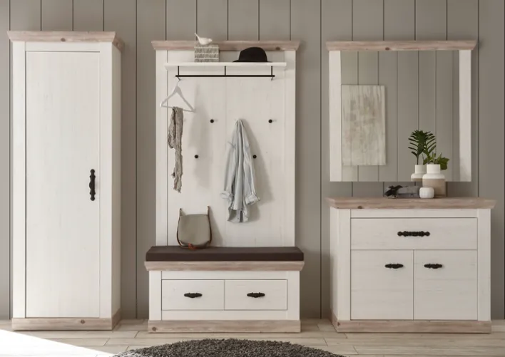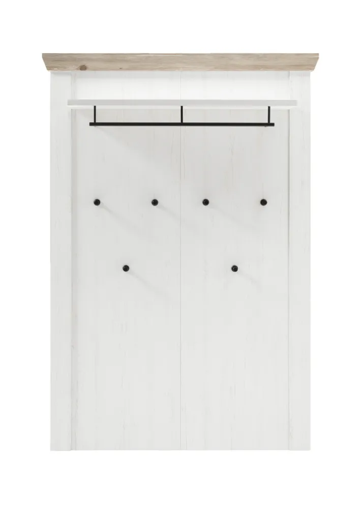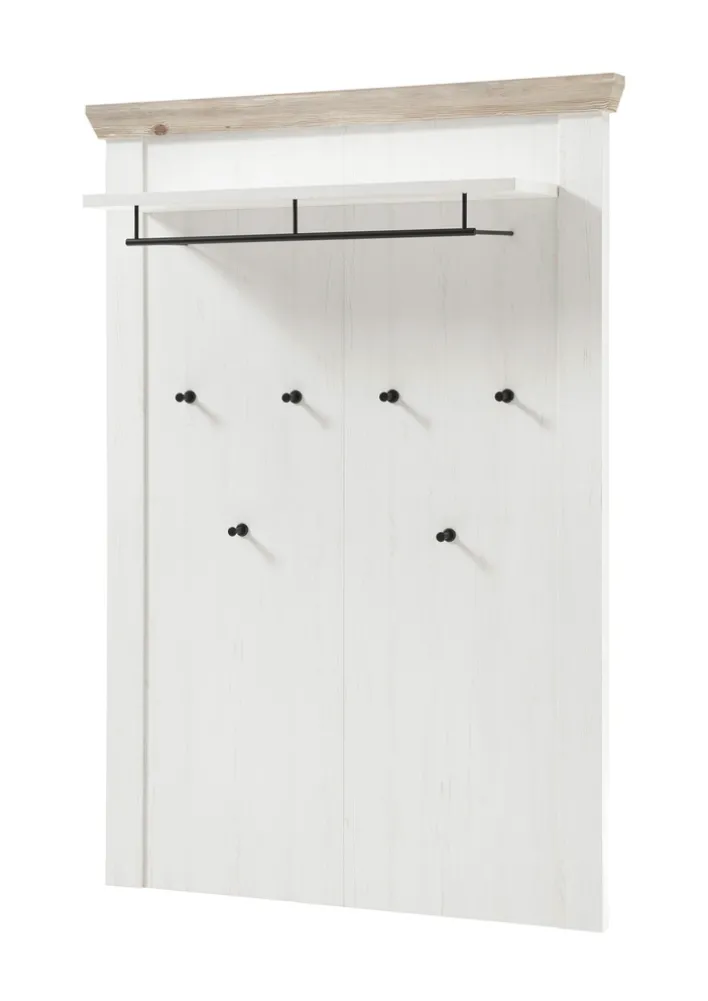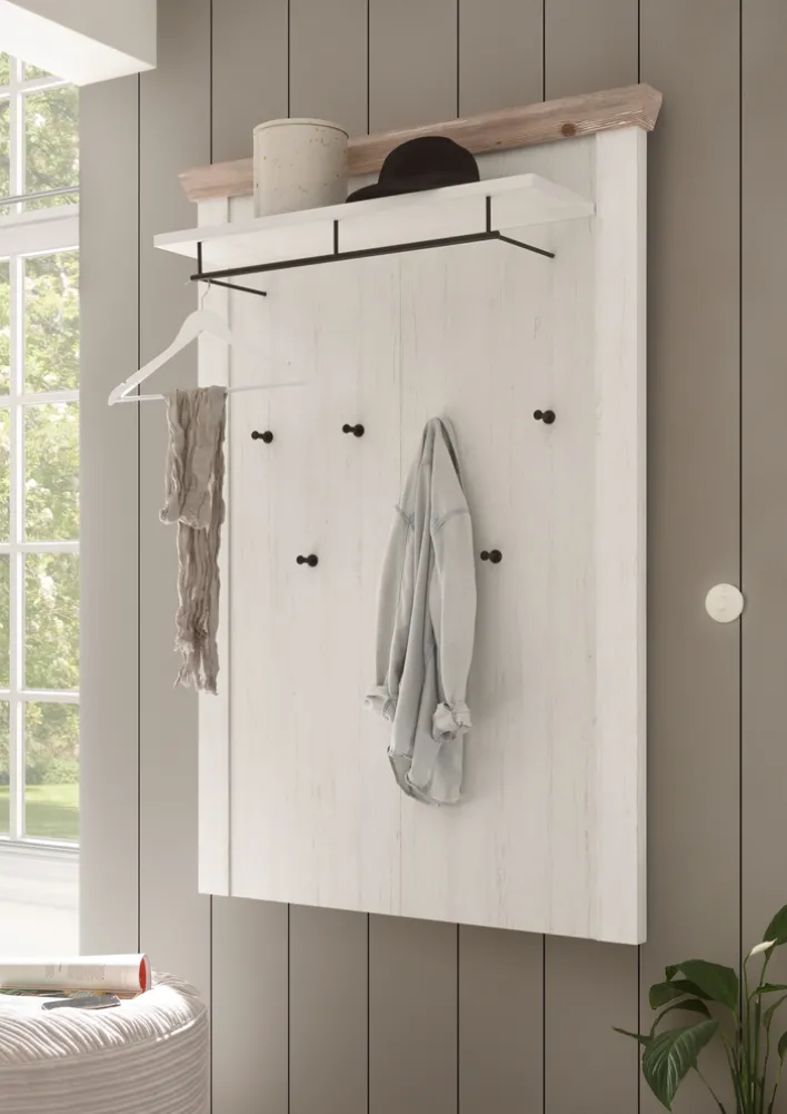 Dieses Garderobenpaneel ist ein absoluter Blickfang im Flur, sodass jeder Besucher einen positiven ersten Eindruck von der Wohnung bekommt. Dies liegt unter anderem am Korpus aus Holznachbildigung in weißem Pinien-Dekor sowie den Applikationen in Pinie-Oslo-Dekor und dem schwarzen Metall. Das Paneel hat eine Tiefe von 27 cm, wodurch es auch hervorragend in schmalere Flure passt. Es verfügt über sechs Garderobenhaken sowie eine Kleiderstange und eine Hutablage.