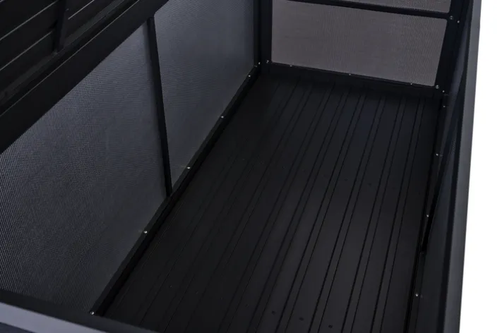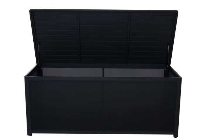 Die Auflagenbox GRADINE M bietet eine praktische und stilvolle Lösung zur Aufbewahrung im Garten. Mit einer Breite von 135 cm, einer Höhe von 59 cm und einer Tiefe von 75 cm bietet sie ausreichend Stauraum für Kissen und andere Gartenutensilien. Die Box ist in einem eleganten Schwarz gehalten, das sich nahtlos in verschiedene Gartenstile einfügt. Das Design ist rechteckig und passt perfekt zu einem modernen, industriellen oder skandinavischen Stil. Gefertigt aus robustem Metall und Kunststoff, ist die Auflagenbox sowohl langlebig als auch wetterbeständig. Die pulverbeschichtete Oberfläche aus Aluminium sorgt für zusätzlichen Schutz und eine ansprechende Optik. Die Box ist klappbar, was die Handhabung erleichtert und bei Nichtgebrauch Platz spart. Ein weiteres praktisches Merkmal ist der Stauraum, der für Ordnung im Außenbereich sorgt.