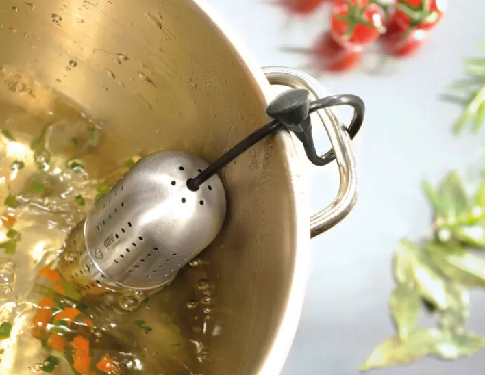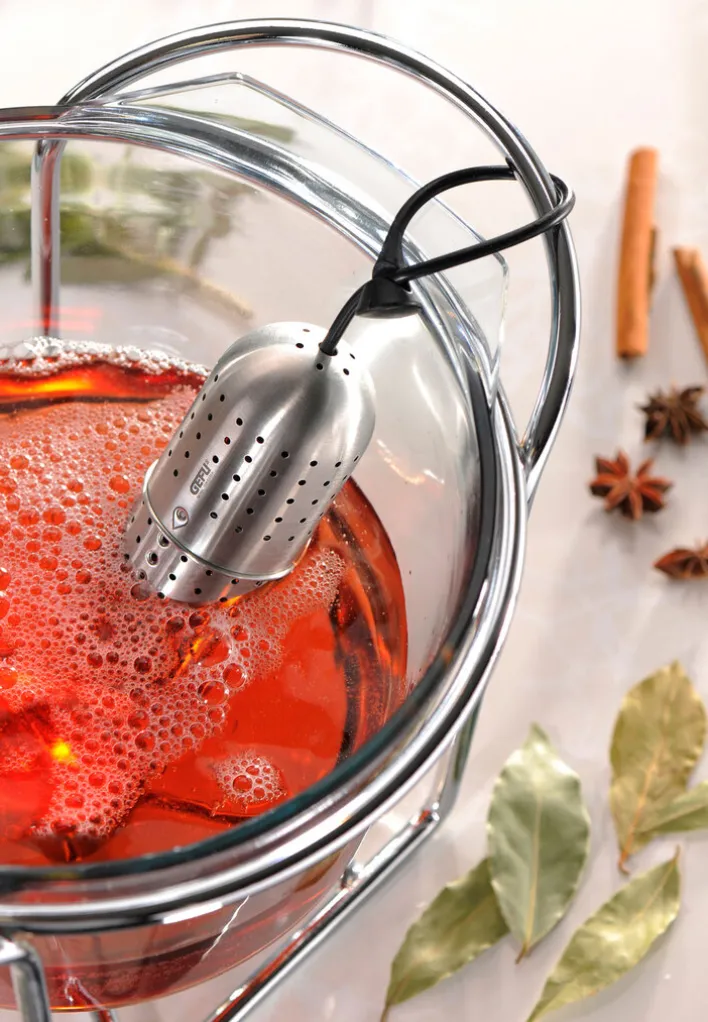 Das GEFU Gewürz-Sieb GUSTO in den Farben Schwarz und Silberfarbig eignet sich zur schonenden Verfeinerung von Suppen, Eintöpfen, Soßen und Getränken noch während der Erhitzung. Warum nicht einen Glühwein mit schmackhaften Gewürzen verfeinern? Außerdem können in das ellipsenförmige Sieb Lorbeerblätter und Kräuter eingefüllt werden. Anschließend wird es mittels der angebrachten Halterung am Henkel des Topfes befestigt. Verschiedene Volumina können mühelos in vier Stufen eingestellt werden. Durch die eingestanzten Öffnungen entweicht die Hitze während des Erhitzungsvorgangs.