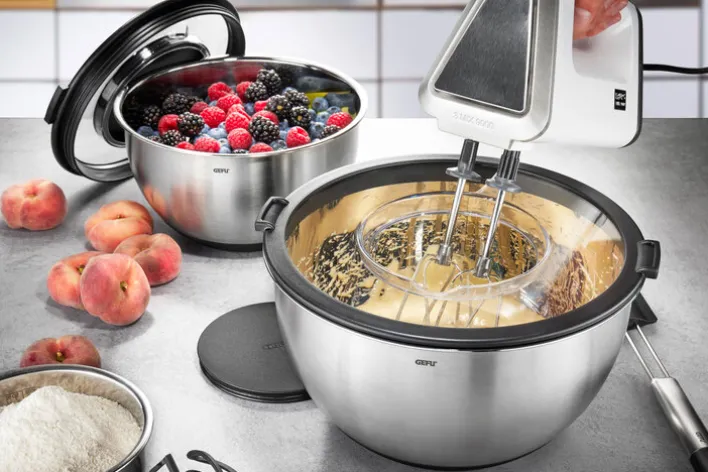 Das Set von GEFU eignet sich beispielsweise als Salataufbewahrung. Die Deckel fungieren als Spritzschutzdeckel. Durch die Öffnung in der Mitte kann unter anderem Sahne spritzfrei geschlagen werden. Das Set ist für die Spülmaschine geeignet und bringt insgesamt ein Fassungsvermögen von 7000 ml mit.