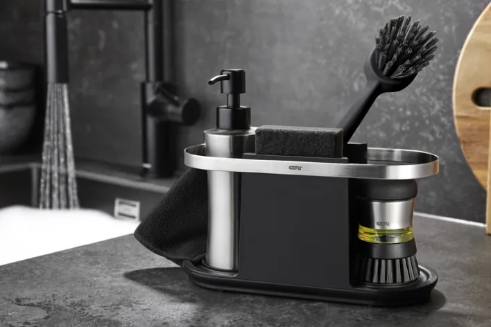 Das Design des Organizers ist modern und funktional. Die Hauptfarbe Schwarz wird durch silberfarbene Akzente ergänzt, die dem Produkt ein elegantes Aussehen verleihen. Der Edelstahlgriff sorgt für eine einfache Handhabung und verleiht dem Organizer eine zusätzliche ästhetische Note. Die geriffelte Struktur der Ablageflächen verhindert das Verrutschen von Gegenständen und sorgt für zusätzliche Stabilität. Dieses Produkt ist ideal für alle, die Wert auf Ordnung und Stil in ihrer Küche legen.