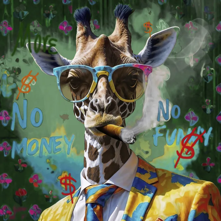 Das Glas Wandbild misst 50 cm in Breite und Höhe bei einer Tiefe von 1,3 cm. Es wiegt 2,53 kg. Das Motiv zeigt eine Giraffe, die auffällig gekleidet ist und eine Zigarre raucht. Die Giraffe trägt eine bunte Sonnenbrille sowie ein farbenfrohes Jackett mit passender Krawatte in Gelb-, Blau- und Orangetönen. Im Hintergrund sind zahlreiche bunte Blumen auf einem grünen Grund zu sehen, ergänzt durch Schriftzüge wie ‚No Money‘, ‚No Funny‘ und ‚More‘, die zusammen mit aufgemalten Dollarzeichen das Bild prägen.