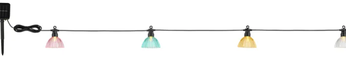 Die GLOBO LED Solar Lichterkette HERIBERT ist 360 cm lang. Sie ist spritzwassergeschützt und verfügt über einen Druckschalter. 10 bunte Lampen mit fest verbauten LED-Leuchtmitteln sorgen für stimmungsvolles Licht.