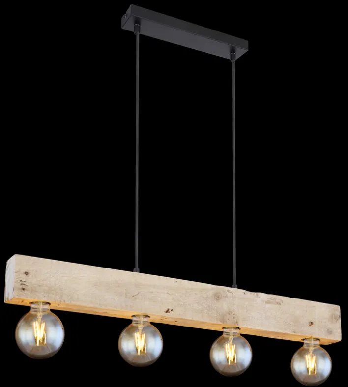 Das GLOBO Retrofit Balkenpendel ADALIE ist 80 cm lang, 6 cm breit und maximal 120 cm hoch. Es ist aus naturfarbenem Holz und schwarzem Metall.