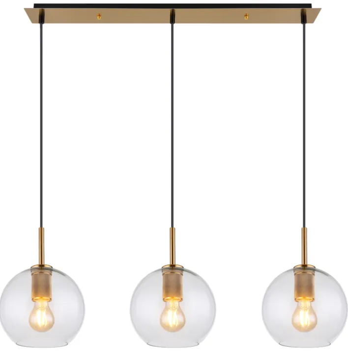 Die dreiflammige Hängeleuchte ADARA kombiniert einen messingfarbigen Metallbalken mit kugelförmigen Lampenschirmen aus Klarglas. Als Balkenpendel eignet sich diese Deckenleuchte zum Beispiel für den Wohn- oder Esszimmertisch.
