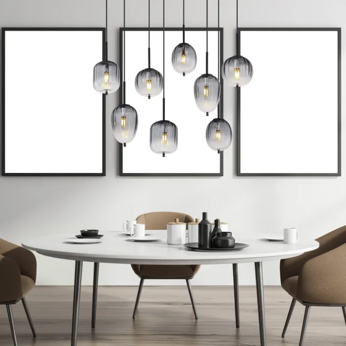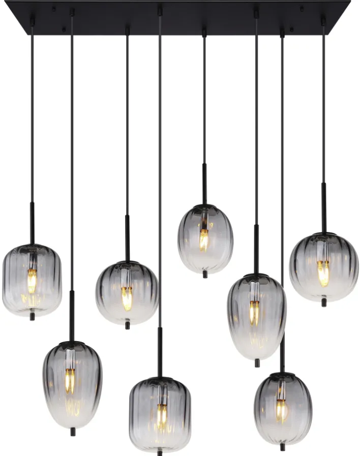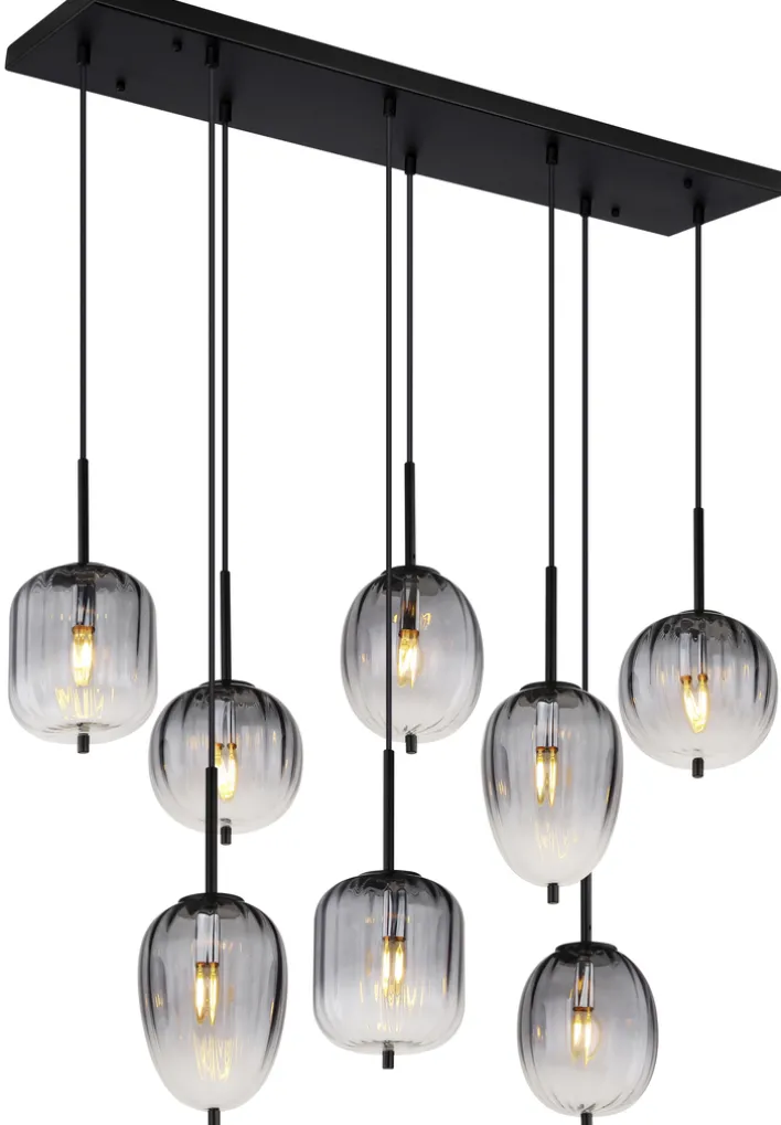 Das Balkenpendel ATTILA von Globo vereint stilvolles Design mit funktionaler Beleuchtung. Mit einer Breite von 102,5 cm und einer Höhe von 120 cm fügt sie sich harmonisch in verschiedene Raumkonzepte ein. Die Leuchte besteht aus hochwertigem Metall und Rauchglas, was ihr eine elegante Optik verleiht. Die acht Brennstellen sind für E14-Leuchtmittel geeignet, die nicht im Lieferumfang enthalten sind, und leicht ausgetauscht werden können. Die Hauptfarbe schwarz kombiniert mit rauchfarbenem Glas sorgt für ein modernes Ambiente. Die Leuchte ist in der Schutzklasse 1 und mit der Schutzart IP20 ausgestattet, was sie ideal für den Innenbereich macht. Der Energieverbrauch beträgt maximal 320 W. Diese Pendelleuchte ist perfekt für den Einsatz über Esstischen oder in Wohnbereichen geeignet und bietet eine gleichmäßige Ausleuchtung. Die bauchige Form der Glaskörper verleiht der Leuchte eine besondere Note.