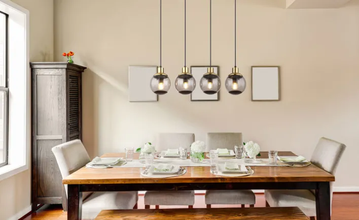 Die Hängelampe POTTER enthält vier Lampenschirme aus hochwertigem Glas. Ihr Korpus ist aus robustem Metall gefertigt. Bestückt wird sie mit ALG oder Retrofit Leuchtmitteln, die einen maximalen Energieverbrauch von 100 Watt und E27-Fassungen aufweisen. Mit ihrem eleganten Design passt sie hervorragend zu einer modernen Einrichtung, kommt aber auch in einem klassischen Ambiente perfekt zur Geltung. Sie ist die ideale Leuchte für Wohn-, Ess- oder Schlafzimmer.