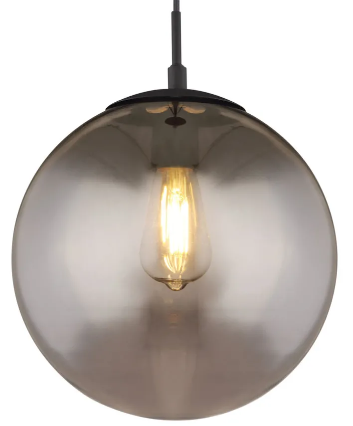 Die GLOBO Retrofit Pendelleuchte BLAMA begeistert mit ihrer attraktiven Kugelform und dem rauchfarbigen Glasschirm, der sich farblich harmonisch von dem schwarzen Korpus absetzt. Sie besitzt einen Durchmesser von 30 cm und wertet jeden Wohnraum auf.