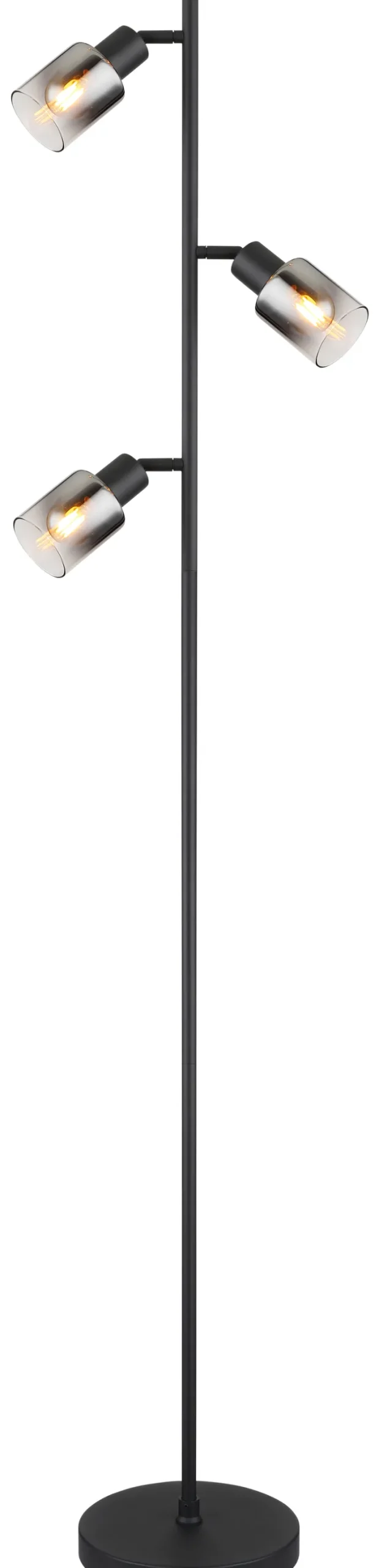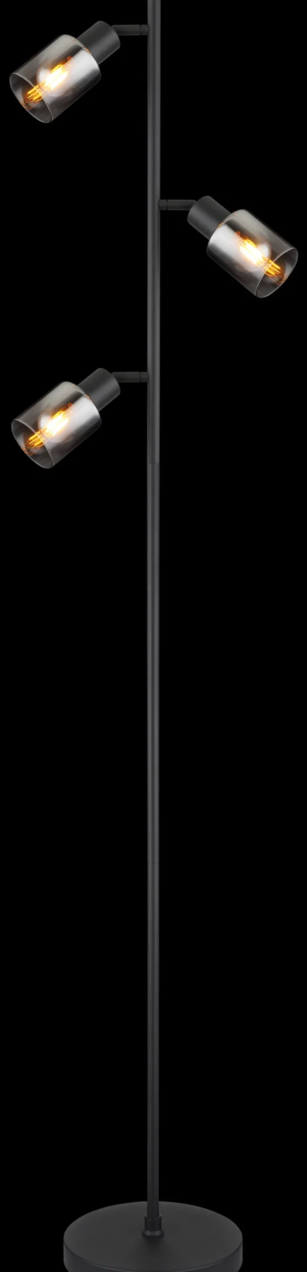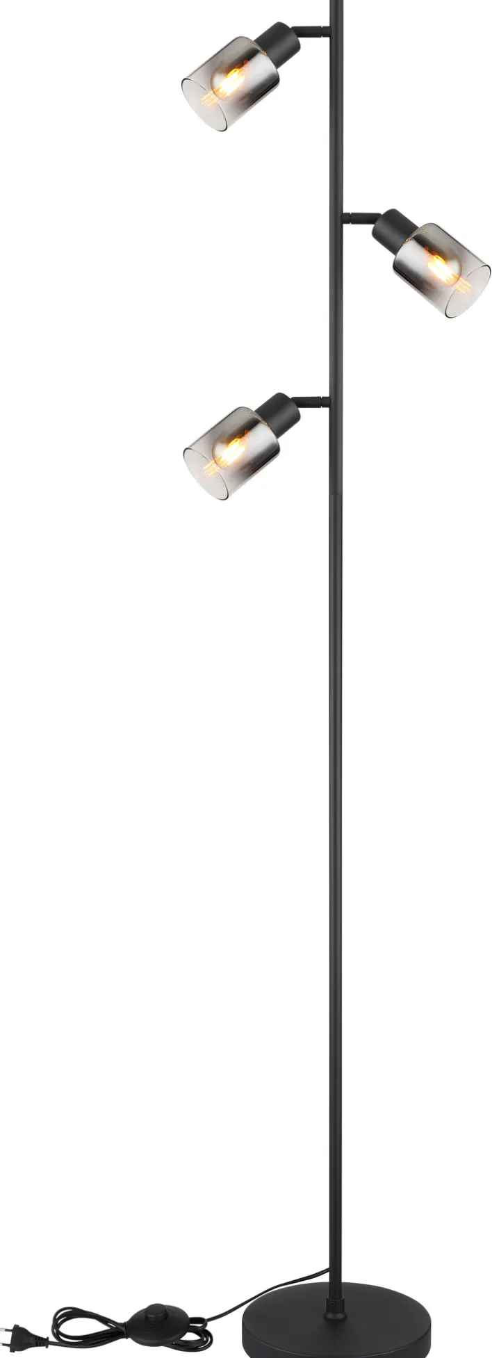 Die GLOBO Retrofit Stehleuchte HUBERTUS ist 154 cm hoch und hat einen Durchmesser von 23 cm, die Lampenschirme haben einen Durchmesser von 7 cm. Sie ist 3-flammig, aus schwarzem Metall und grauem, klaren Glas und verfügt über einen Fußschalter.