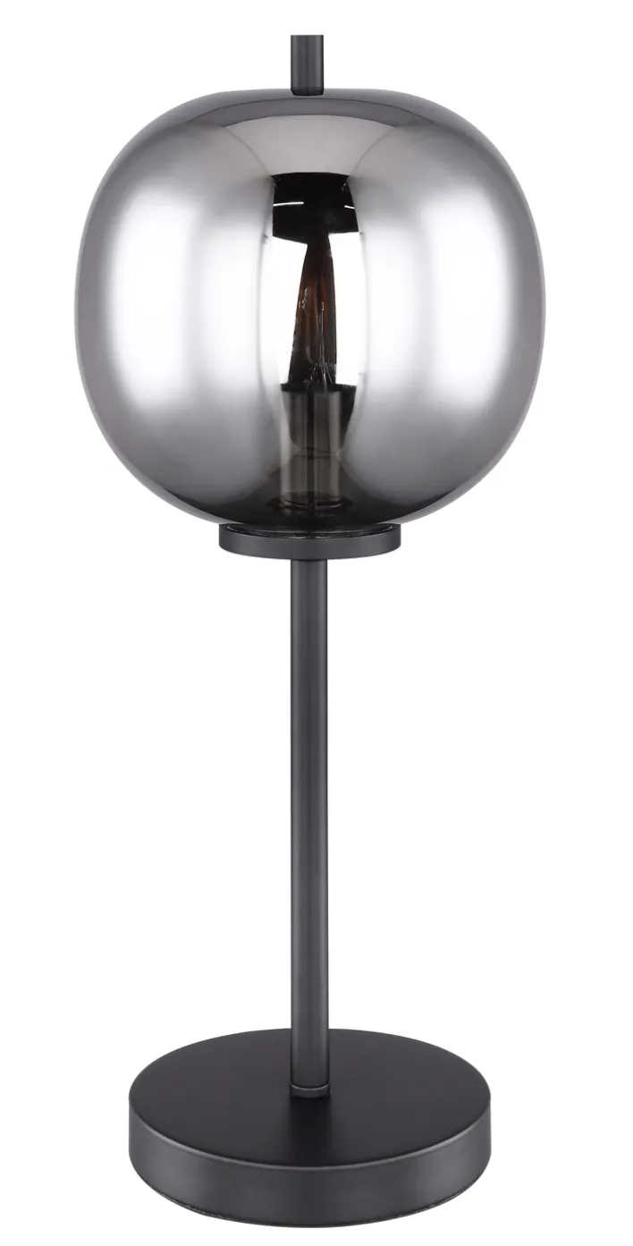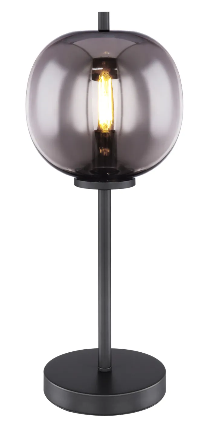 Die GLOBO Retrofit Tischlampe BLACKY ist 45 cm hoch, ihr Durchmesser beträgt 18,5 cm, ihr Gewicht 1,79 kg. Sie ist aus schwarzem Metall und rauchfarbenem Glas. BLACKY hat einen Ein- und Ausschalter.
