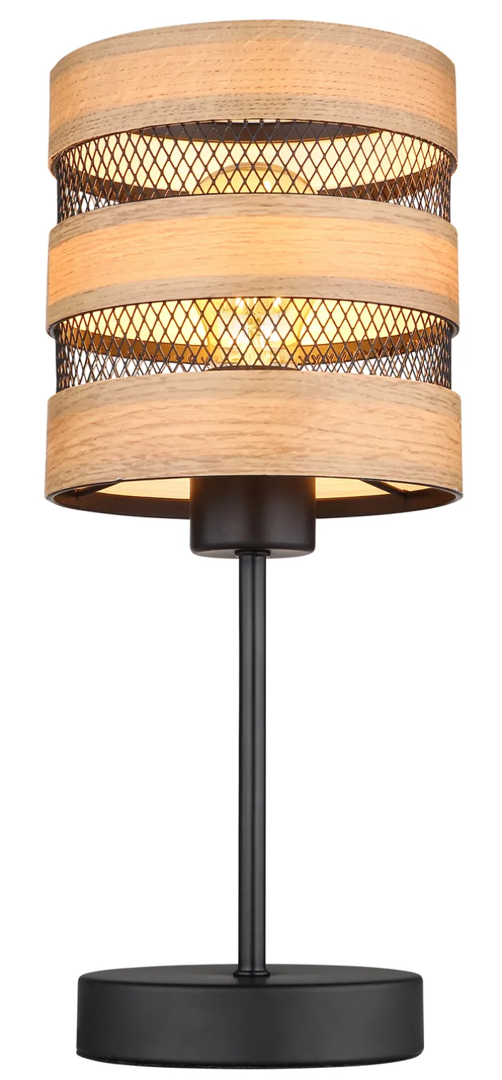 Die GLOBO Retrofit Tischlampe MOITAS ist 1-flammig mit einer Höhe von 33,5 cm. Ihr Durchmesser beträgt 15 cm. Sie ist schwarz, mit einem naturfarbenen Geflecht aus Holznachbildung und verfügt über einen Schnurschalter.