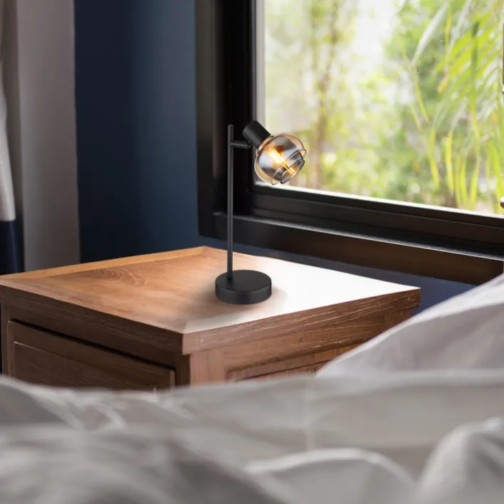 Die GLOBO Retrofit Tischlampe TOKKI ist 35 cm hoch, 12 cm breit und 14,5 cm tief. Sie ist aus schwarzem Metall und Glas in Rauch und Amber. Sie verfügt über einen verstellbaren Schnurschalter.