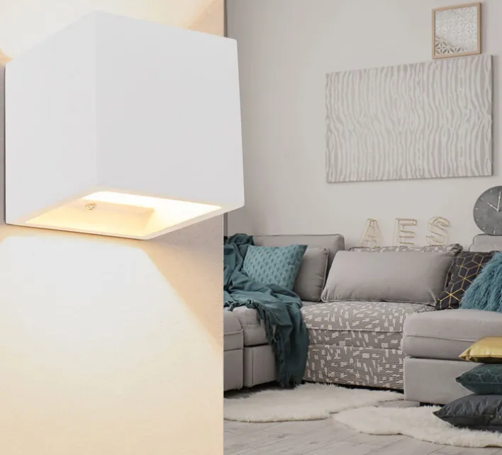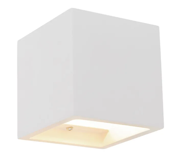 Das Up & Down Licht strahlt aus der würfelförmigen, weißen Wandleuchte CHRISTINE von GLOBO, die aus Gips gestaltet und optisch absolut unauffällig ist. Die Kanten des kleinen Würfels sind jeweils 11,5 Zentimeter lang.