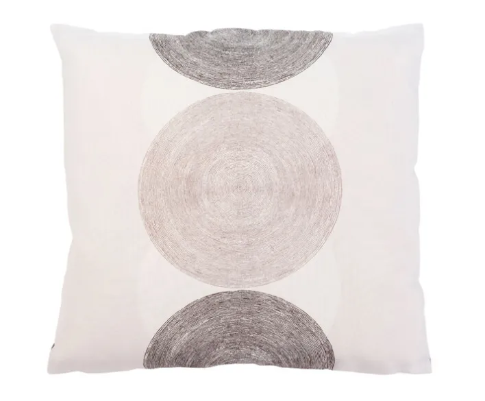 Die Kissenhülle aus der Serie SORENTO misst 50 x 50 cm und besteht vollständig aus Polyester. Das Material ist eine Synthetikfaser, die für ihre Strapazierfähigkeit und Pflegeleichtigkeit bekannt ist. Die Hauptfarbe ist Braun, ergänzt durch Nuancen in Grau, die sich im Muster wiederfinden. Das Design zeigt schlichte, konzentrische Kreise in unterschiedlichen Brauntönen, die mittig angeordnet sind und dem Kissen einen modernen, zugleich dezenten Boho-Stil verleihen. Die Oberfläche wirkt glatt und fein, das Muster hebt sich leicht strukturiert vom Hintergrund ab. Die quadratische Form und das zeitlose Muster eignen sich für verschiedene Wohnbereiche und Einrichtungsstile.