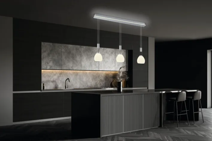 Das Deckengehäuse, die Seilzüge und die zylinderförmigen Gewichte der Pendellampe sind aus nickelfarbigem Metall gestaltet und haben gebürstete Oberflächen. Die nach unten geöffneten Lampenschirme sind aus satiniertem Opalglas hergestellt. Die energieeffizienten LED-Leuchtmittel sind fest in die Pendellampe eingebaut. Die Beleuchtung der Lampe ist mit einer Fernbedienung individuell steuerbar.