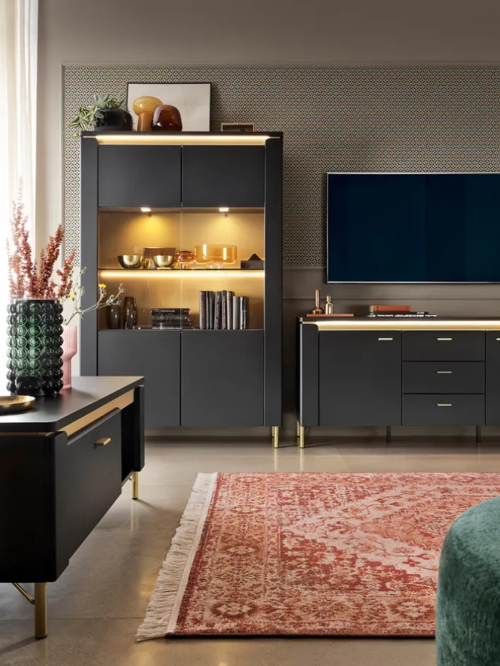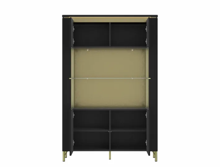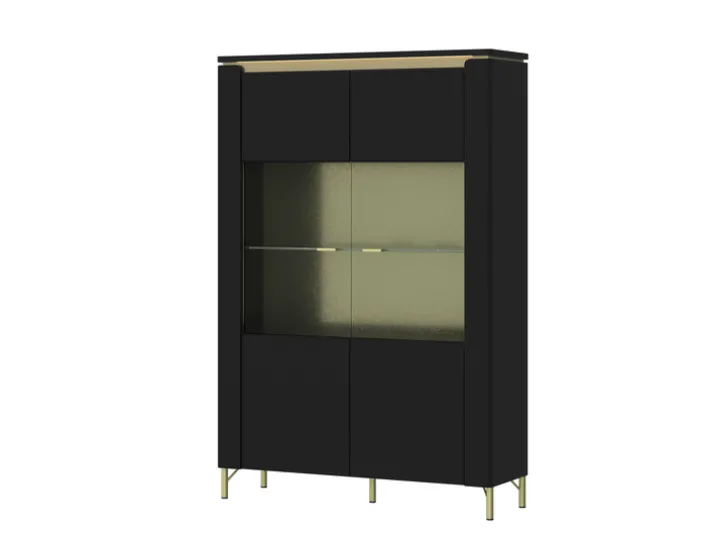 Der Highboard NORICA mit den Maßen 110,4×169,2 cm verleiht jedem Wohnbereich mit seiner matt schwarzen Oberfläche eine elegante Note. Das 40 cm tiefe Highboard verfügt über zwei Drehtüren, hinter denen insgesamt sechs Einlegeböden praktischen Stauraum bieten. Die mittleren Türbereiche sind aus Glas gefertigt und werden durch integrierte Beleuchtung von oben stilvoll in Szene gesetzt.
