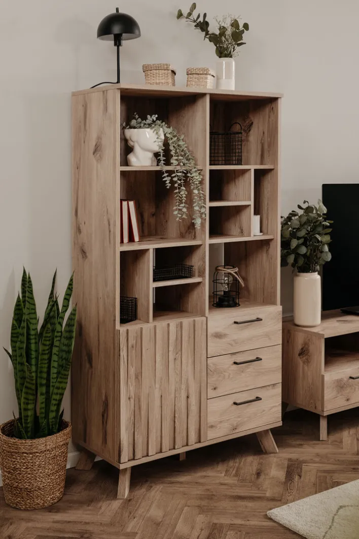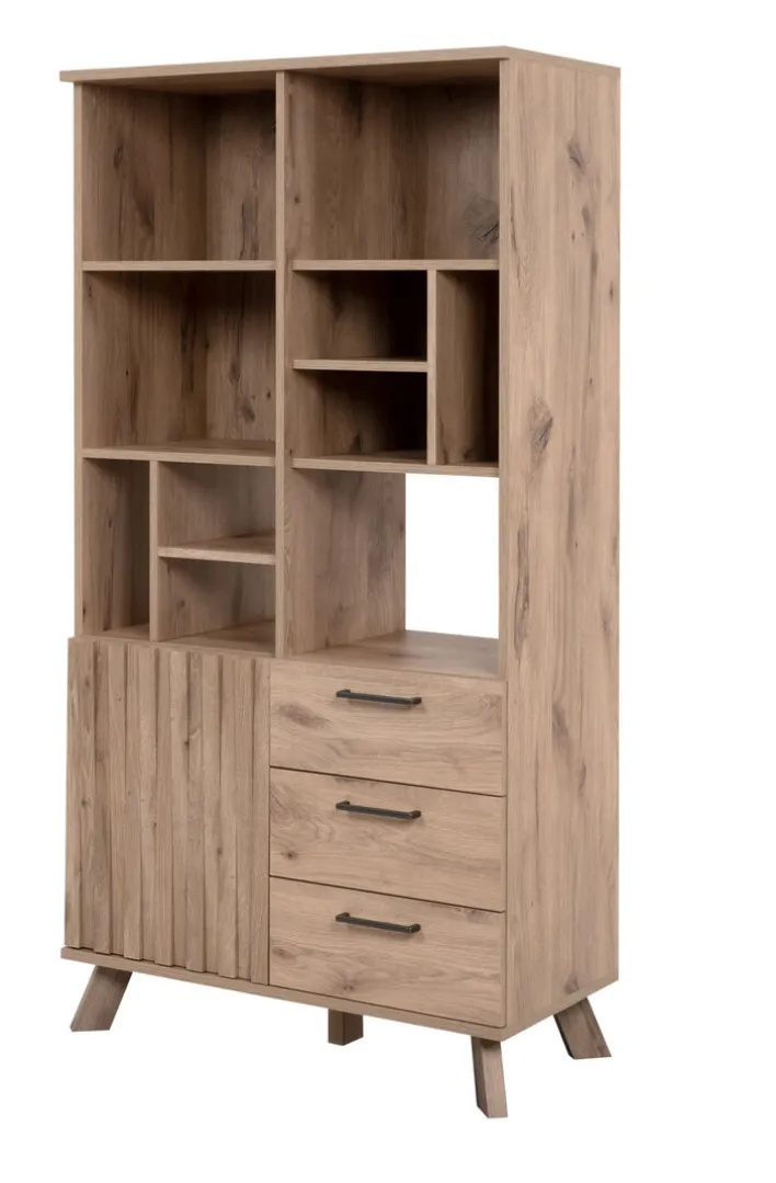 Das Highboard WELLINGTON besteht aus solider Holznachbildung. Es besticht mit einem wunderschönen matten Braun, mit dem der Wohnraum im Nu gemütlich wirkt. Dank stilvoller Maserung strahlt das Möbelstück zudem Natürlichkeit aus. Zu überzeugen weiß das Highboard natürlich nicht nur einer ansprechenden Optik! In zehn offenen Fächern bietet es ausreichend Platz für Bücher und Dekorationsartikel. Zudem finden im Schrankteil mit drei Schubladen und zwei geschlossenen Fächern viele Alltagsgegenstände Platz.