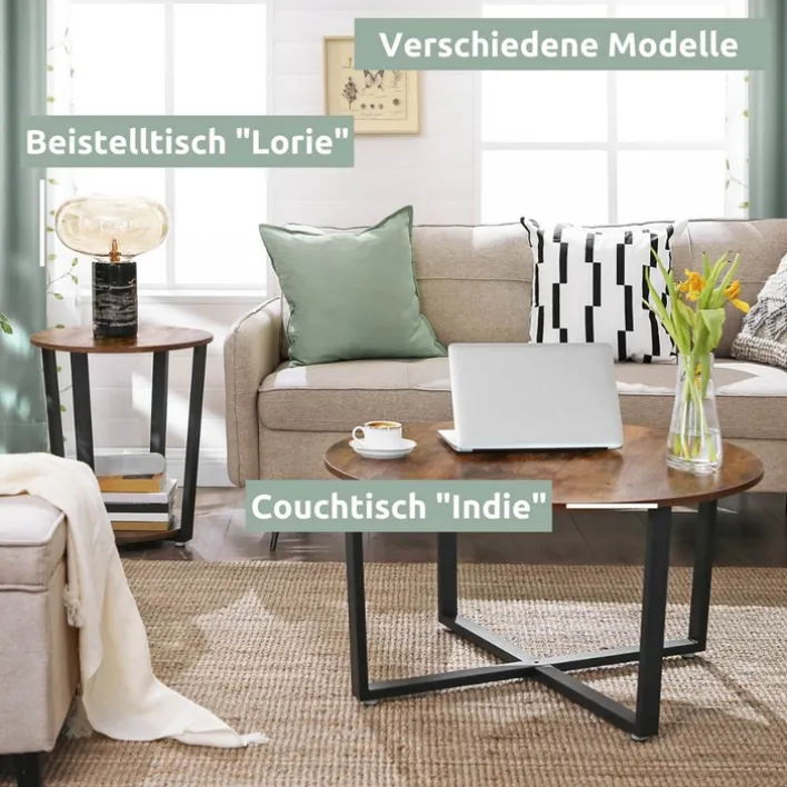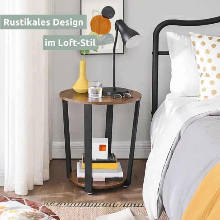 Der runde holz4home Beistelltisch mit den Abmessungen 50 x 57 cm präsentiert sich im angesagten Industrie-Stil und passt in moderne Einrichtungen. Durch das elegante Holzdekor der Ablageböden in Vintagebraun und das schwarzfarbige Gestell fällt der Beisteller sofort ins Auge. Der Tisch eignet sich für Wohn- oder Esszimmer und ist auch für eine gemütliche Sitzecke die passende Ergänzung. Die Ablagen bieten viel Platz für verschiedene Accessoires. Der Beistelltisch hat Charme und sorgt für eine wohnliche Atmosphäre.