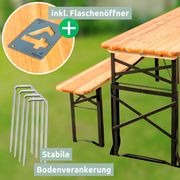 Unverwechselbar, ein Klassiker: Nichts ist bei Feiern beliebter als die traditionelle Biertischgarnitur. Die BIERBANK ist im Partyzelt, auf der Terrasse oder der Wiese schnell aufgebaut. Die Bodenanker sorgen für zusätzliche Stabilität, so darf es ruhig auch einmal hoch hergehen. Platzsparend weggeräumt ist die Bierzeltgarnitur der beliebten Marke holz4home ebenfalls im Nu. An den zum Lieferumfang gehörenden Wandhalterungen wartet sie auf ihren nächsten Einsatz.
