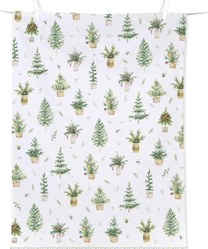 Das Geschirrtuch aus der Serie FESTIVE HOLIDAYS besteht aus reiner Baumwolle und misst 70 cm in der Breite sowie 50 cm in der Tiefe. Die Oberfläche ist mit einem regelmäßig angeordneten Muster kleiner Tannenbäume in verschiedenen Grüntönen bedruckt, wobei die Bäume jeweils in unterschiedlich gestalteten Töpfen stehen. Die Hauptfarbe ist Weiß, während die Motivdetails überwiegend in Grün gehalten sind. Zusätzlich zeigen sich dezente Akzente in weiteren Farben, die als Christbaumschmuck und Topfdetails eingesetzt sind. Das Material besteht aus einem natürlichen Textilgewebe mit glatter, leichter Struktur. Das Geschirrtuch eignet sich für den Einsatz in der Küche und bringt durch das weihnachtliche Motiv eine saisonale Note in den Wohnbereich.