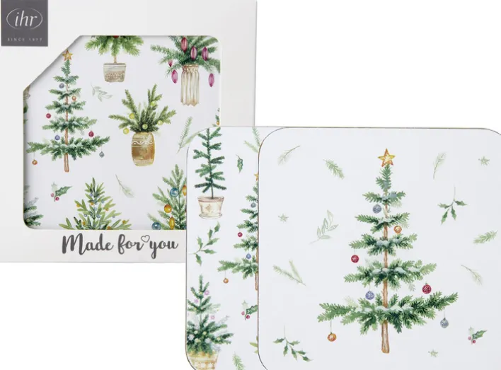 Dieser Glasuntersetzer aus der Serie FESTIVE HOLIDAYS misst 10 x 10 cm bei einer Höhe von 1 cm und besteht aus dem Naturmaterial Kork. Die Hauptfarbe ist Grün, ergänzt durch weitere natürliche Farbtöne, wie sie bei den abgebildeten Weihnachtsbäumen und Zweigen sichtbar sind. Das Design zeigt mehrere Tannenbäume und Tannenzweige, die mit verschiedenen Weihnachtskugeln, Sternen und festlichen Elementen geschmückt sind. Die Motive sind auf einem weißen Hintergrund angeordnet, was das saisonale Thema klar unterstreicht und für eine dezente, festliche Optik sorgt. Die Oberfläche ist glatt, die Ecken sind abgerundet. Das Produkt eignet sich für den Einsatz als Glasuntersetzer und schützt empfindliche Oberflächen vor Feuchtigkeit und Kratzern. Die Kombination aus Kork als Material und dem weihnachtlichen Motiv macht diesen Untersetzer zu einem passenden Accessoire für die Festtage.