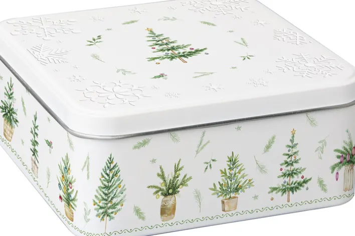Die Keksdose aus Metall präsentiert sich in quadratischer Form mit einer Breite und Tiefe von jeweils 22 cm sowie einer Höhe von 8,5 cm. Das Hauptmaterial ist Metall. Die Oberfläche ist weiß gehalten und mit verschiedenen Weihnachtsmotiven verziert, darunter mehrere stilisierte, grüne Tannenbäume in unterschiedlichen Gefäßen. Zusätzlich finden sich vereinzelt grüne Zweige und festliche Kugeln als dekorative Elemente. Auf dem Deckel sind Schneeflocken als dezente Prägung sowie ein zentral platzierter Weihnachtsbaum abgebildet. Die Motive greifen festliche Feiertagsthemen auf und vermitteln einen saisonalen Charakter. Die Dose ist vollständig aus synthetischer Faser gefertigt und eignet sich zur Aufbewahrung von Keksen und Gebäck.