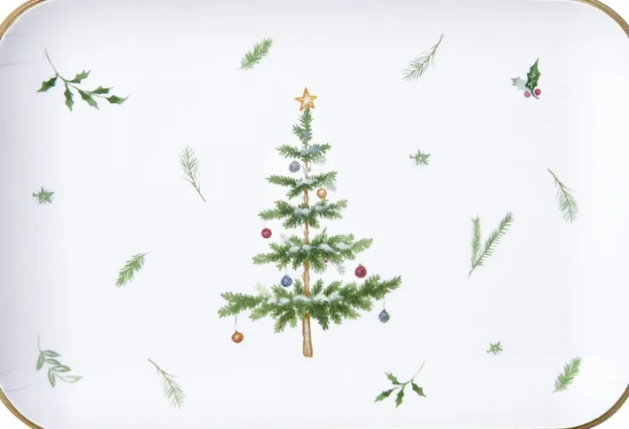 Dieses Tablett aus der Serie FESTIVE HOLIDAYS besteht aus Holz und misst 20 cm in der Breite, 13 cm in der Tiefe und 15 cm in der Höhe. Die Hauptfarbe ist Grün, unterstützt durch einen weißen Hintergrund. Das Motiv auf der Oberfläche zeigt einen geschmückten Weihnachtsbaum mit kleinen, farbigen Kugeln und einem goldenen Stern an der Spitze. Um den Baum herum sind verschiedene grüne Tannenzweige und Blätter verteilt. Das Tablett besitzt eine rechteckige Form mit abgerundeten Ecken und einem schmalen, goldfarbenen Rand. Die Oberfläche wirkt glatt und die Gestaltung ist klar auf das weihnachtliche Thema abgestimmt.