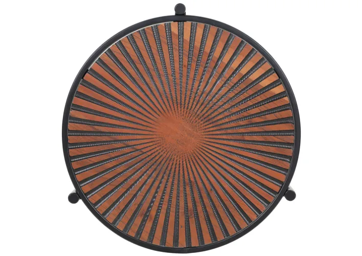 Auffällig ist das sternförmige Muster, das in die Holzoberfläche eingearbeitet ist und dem Tisch eine besondere Struktur sowie eine dezente grafische Wirkung verleiht.