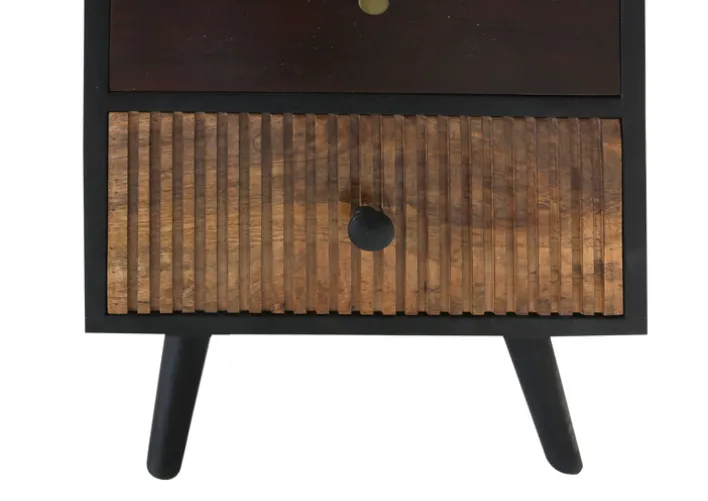 Mit ihrer außergewöhnlichen Optik ist die Kommode ein Eyecatcher für verschiedene Wohnräume. Während der Korpus aus schwarz gebeiztem und lackiertem Mango Massivholz elegant wirkt, verleihen die mehrfarbigen Fronten einen typischen Retro-Look. Das Innere der Schubladen besteht aus strapazierfähigem MDF. In den fünf Schubkästen hält das Möbelstück ausreichend Stauraum bereit. Zudem bietet die Kommode eine strapazierfähige Deckplatte, die sich zum Abstellen von Dekorationen oder kleinen Zimmerpflanzen eignet.
