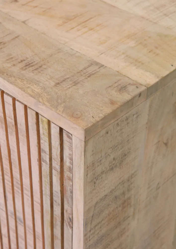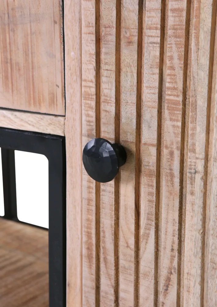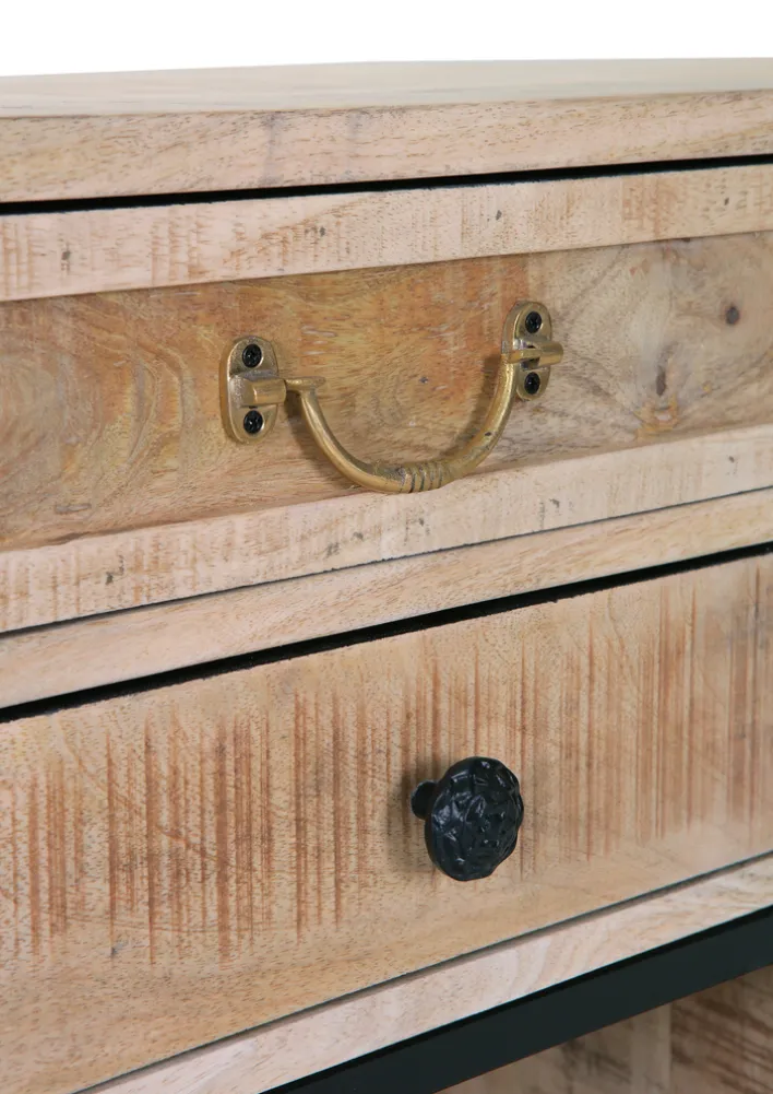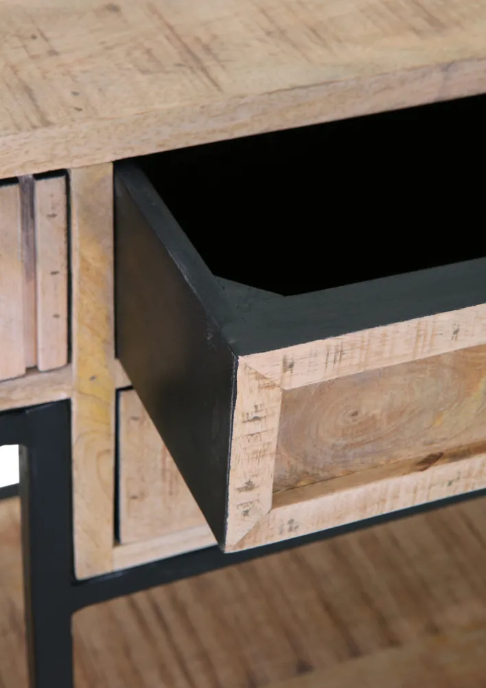 Die INTERhome Konsole NEMESIS ist 130 cm breit, 38 cm tief und 75 cm hoch. Sie ist aus 130 x 75 cm Mango massiv natur mit einem Metallgestell in Schwarz und hat 3 Schubkästen und 2 Fächer.