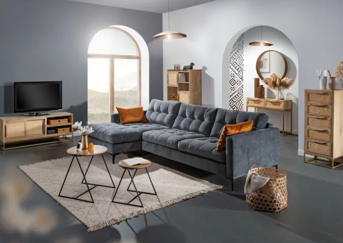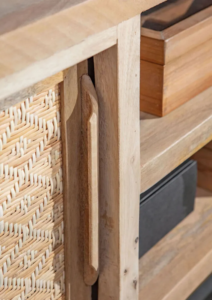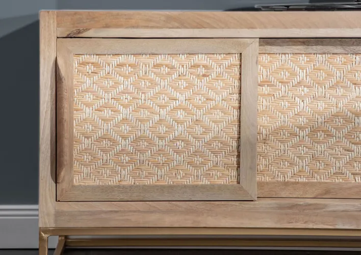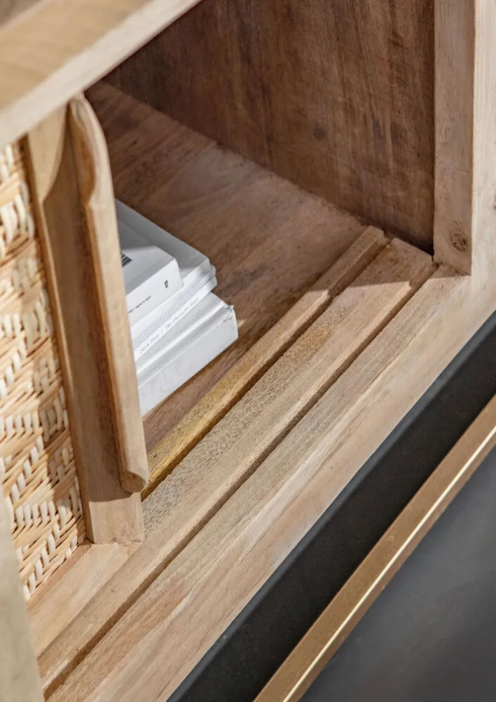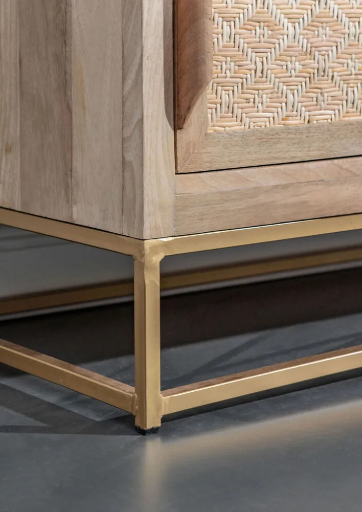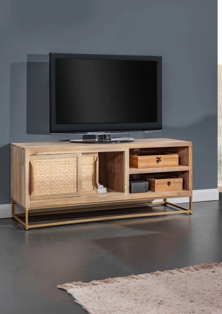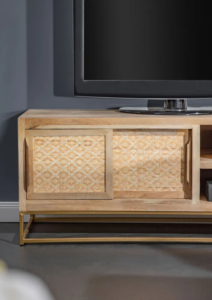 Das Lowboard BAHAR besteht aus gebeiztem und lackiertem Mango-Massivholz. Goldfarbig pulverbeschichtete Metallfüße und Fronten in Rattan-Optik perfektionieren das extravagante Design. Zusätzlich zum spannenden Look bietet das Lowboard zwei offene Gerätefächer mit praktischem Kabeldurchlass. Hinter den Schwebetüren finden hingegen Alltagsgegenstände ihren Platz. Das Lowboard harmoniert perfekt mit den Wohnzimmermöbeln der BAHAR-Serie und verleiht dem Wohnzimmer im Nu eine gemütliche Atmosphäre. Familie und Freunde fühlen sich somit immer willkommen.
