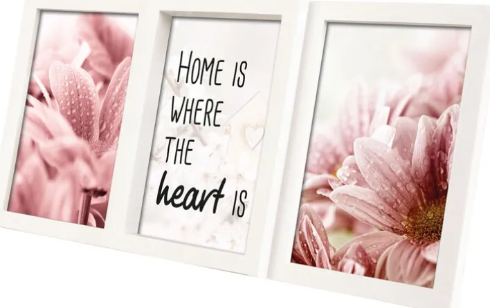 Dieser Bilderrahmen setzt sich aus drei kleineren rechteckigen Rahmen zusammen, die aus Kunststoff bestehen und dadurch sehr unempfindlich sind. Sie haben eine klare, moderne Formgebung und zeigen sich in trendstarkem Weiß. Darüber hinaus ist jeder der drei Rahmen mit einer schützenden Glasscheibe ausgestattet. Dank des schlichten und zeitlosen Designs passt der Bilderrahmen in fast jede Inneneinrichtung und bietet sich außerdem für jede Saison an. Er lässt sich beispielsweise wunderbar mit Familienfotos oder schönen Urlaubsfotos bestücken.