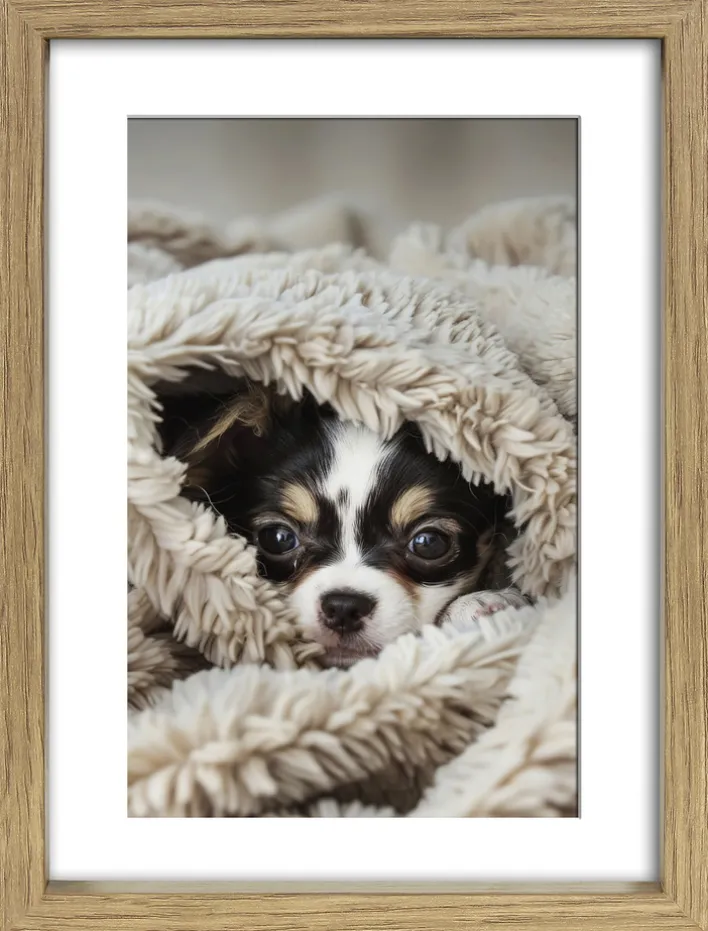 Das abgebildete Motiv zeigt einen kleinen Hund, der teilweise von einer cremefarbenen, flauschigen Decke umgeben ist. Die Bildkomposition hebt die feinen Details des Fells sowie die kontrastreichen, klaren Farben hervor. Der Rahmen ist für den Einsatz im Innenbereich konzipiert und bietet mit seiner dezenten Gestaltung eine passende Ergänzung zu verschiedenen Einrichtungsstilen. Die Marke INTERTRADING steht dabei für eine ausgewogene Kombination aus Funktionalität und ansprechender Optik.