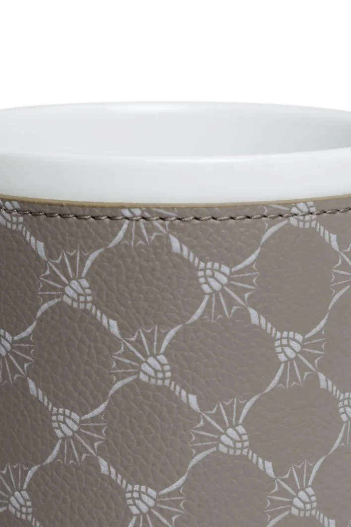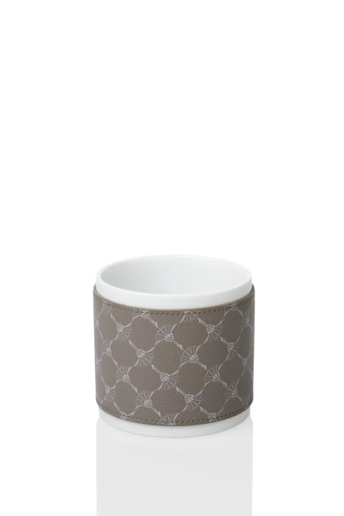 Gefertigt aus weißem Porzellan, besitzt der Becher eine runde Form mit einer Höhe von 9 cm und einem Durchmesser von 9,5 cm. Das Gewicht beträgt 0,30 kg. Die äußere Oberfläche ist mit einer kunstledernen Manschette in Grau versehen, die ein dezentes geometrisches Muster zeigt und für eine angenehme Haptik sorgt.