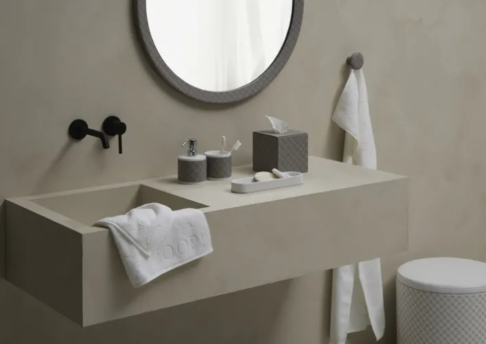 Die Farbgebung in Grau und Weiß unterstreicht den modernen Stil und macht den Becher vielseitig einsetzbar im Badezimmer. Die Kombination aus Keramik und Textil betont die hochwertige Verarbeitung und das zeitgemäße Design.