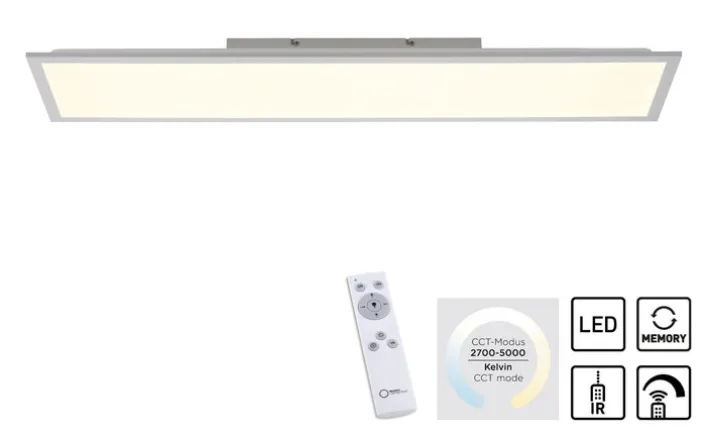 Die LED Deckenlampe FLAT ist 100 cm lang, 25 cm breit und 2,9 kg schwer. Korpus und Schirm sind aus weißem Kunststoff gefertigt. Diese moderne Lampe ist einflammig und verfügt über eine Lichtfarbverstellung-, eine Infrarot- und eine Memory-Funktion. Die LED Deckenlampe FLAT ist ein Produkt des renommierten Herstellers JUST LIGHT und für alle Räume des Innenbereichs hervorragend geeignet. Die LED-Leuchte ist fest eingebaut, die Helligkeit ist dimmbar und der Energieverbrauch beträgt bei einer maximalen Lichtleistung von 2600 Lumen 21 Watt. Die Farbtemperatur reicht von 2700 bis 5000 Kelvin. Die Lampe wird teilmontiert zugestellt, im Lieferumfang ist zudem eine Fernbedienung enthalten.