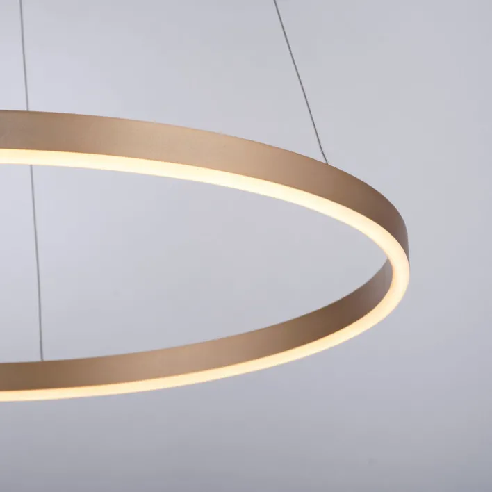 Die ringförmige LED Pendelleuchte RITUS von JUST LIGHT hat einen Durchmesser von 58 cm und ist die optimale Beleuchtung für den modern eingerichteten Wohn- oder Essbereich. Die messingfarbige Leuchte mit einer Brennstelle fügt sich harmonisch in bereits bestehende Einrichtungen ein und kommt über runden und eckigen Esstischen optimal zur Geltung. Ausgestattet mit Switchmo ist die Leuchte in drei Stufen dimmbar. Dadurch sorgt die Pendelleuchte immer für eine angenehme Beleuchtung. Die Befestigung und das ringförmige Pendel der Pendelleuchte RITUS sind aus hochwertig verarbeitetem Kunststoff hergestellt. Das sparsame LED-Leuchtmittel ist fest in das Gehäuse eingebaut. Die Pendelleuchte ist CE-geprüft und für den Innenbereich geeignet.