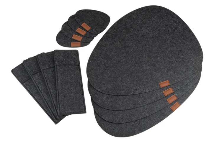 Das JUSTINUS Tisch-Set LIFESTYLE 12-teilig Filz anthrazit besteht aus 4 Platzsets mit jeweils 4 Untersetzern für Teller und Trinkgefäße und Bestecktaschen. Das Set ist 0,4 cm hoch und 33 cm breit. Bei einer Tiefe von 43 cm wiegt es 0,44 kg und ist eine schlichte, stilvolle Ergänzung auf dem gedeckten Tisch.
