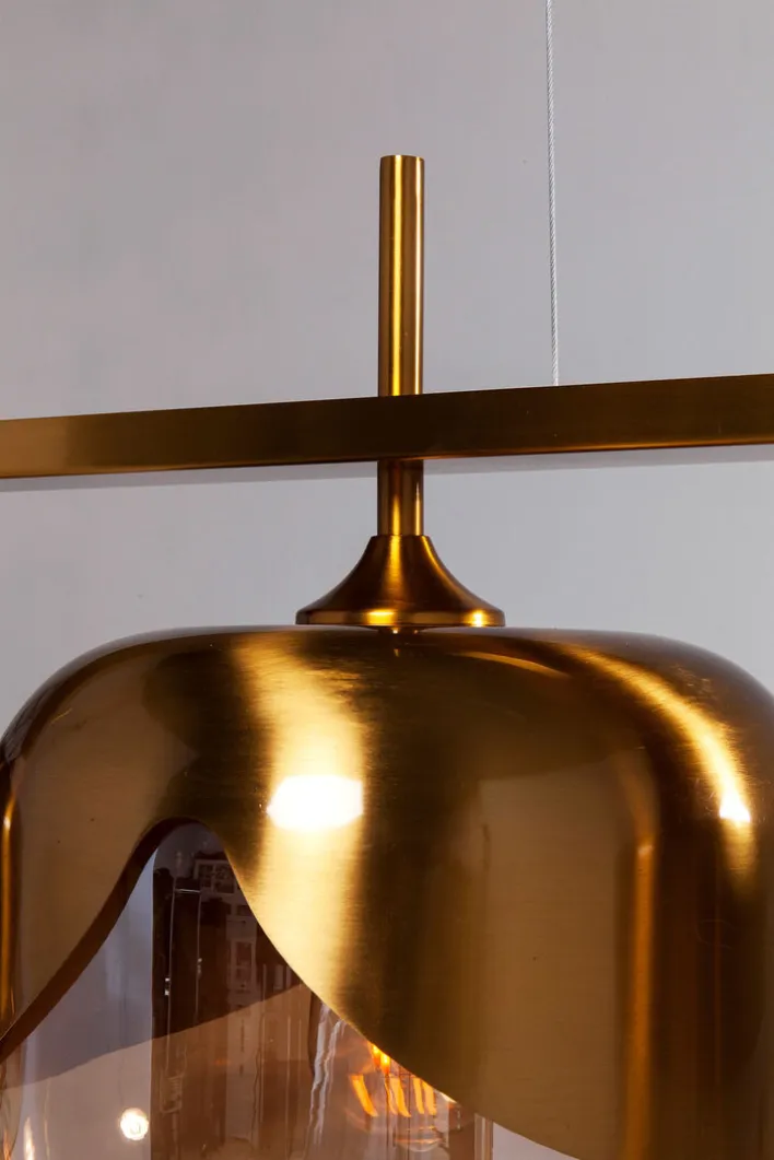 Die KARE DESIGN Retrofit Hängelampe GLOBLET QUATTRO hängt 143 cm von der Decke und ist mit ihren vier Lampenschirmen 129 cm breit. Ihre Lampenschirme kombinieren Farbglas mit messingfarbig beschichtetem Stahl, wodurch sie wie umgedrehte Kelche wirken. Für jeden Lampenschirm wird zusätzlich eine 40 Watt AGL oder Retrofit Glühbirne mit E27 Fassung benötigt. Die zweifarbigen Lampenschirme sorgen für ein stilvolles, blendfreies Licht und schaffen ein komfortables Ambiente, in dem sich Familie und Freunde gerne aufhalten.