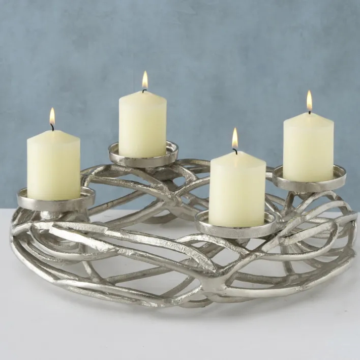 Der Kerzenleuchter Ringval ist aluminiumfarbig, bietet Platz für 4 Kerzen und hat einen Durchmesser von 40 cm.