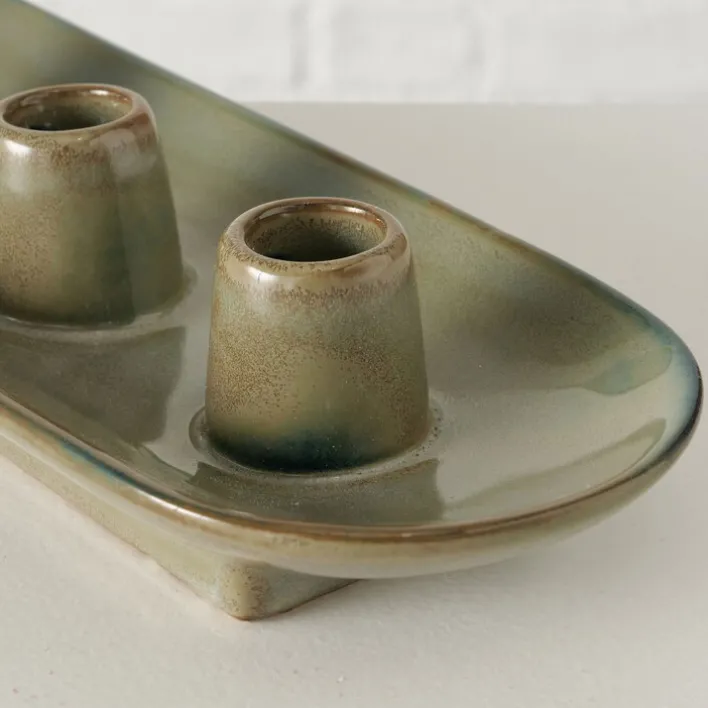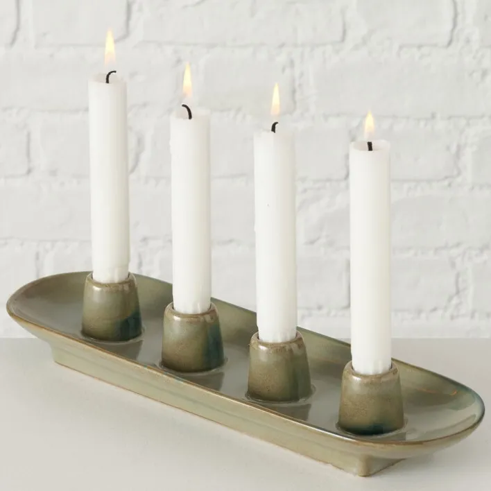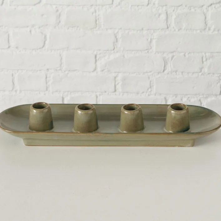Der Kerzenständer PERUYA in sanftem Grün hat eine Höhe von 6 cm, eine Breite von 34 cm und eine Tiefe von 10 cm. Der schlichte und zeitlose Kerzenhalter ist für bis zu vier Stabkerzen geeignet und lässt sich vielfältig kombinieren. Der Kerzenständer PERUYA ist aus hochwertigem Porzellan gefertigt. Der sanfte Grünton des Kerzentellers harmoniert perfekt mit Kerzen in unterschiedlichen Farben und ist ein Blickfang in jedem Innenraum. Dank des schlichten Designs kann der Kerzenständer bei unterschiedlichen Einrichtungsstilen zum Einsatz kommen. Egal ob im Wohn- oder Esszimmer, im Schlafzimmer oder im Flur, der Kerzenständer sorgt überall für ein ansprechendes und gemütliches Ambiente.