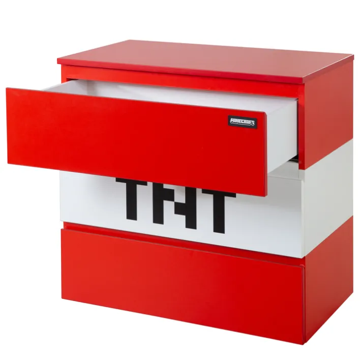 Drei Schubkästen sorgen für großzügigen Stauraum und damit für Ordnung im Kinderzimmer. Das TNT-Design wird zum Blickfang und sorgt dafür, dass die Kinder-Kommode MINECRAFT 80 cm rot/ weiß/ schwarz zum Lieblingsstück wird. Diese Kommode wiegt 37 kg und bietet Sicherheit, da sie nicht verrutscht werden kann. Ihr frisches und kindgerechtes Design sorgt für Freude und reiht sich in jede farbenfrohe und fröhliche Kinderzimmereinrichtung ein.