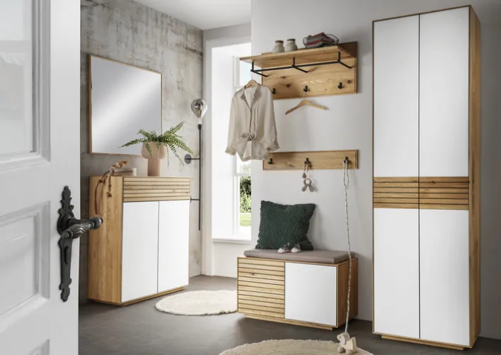 Mit einer Breite von 80 cm, einer Höhe von 103 cm und einer Tiefe von 37 cm bietet sie ausreichend Stauraum für verschiedene Wohnbereiche. Die Hauptfarbe ist Weiß, ergänzt durch natürliche Eiche, die geölt ist, was der Kommode eine warme und einladende Ausstrahlung verleiht.