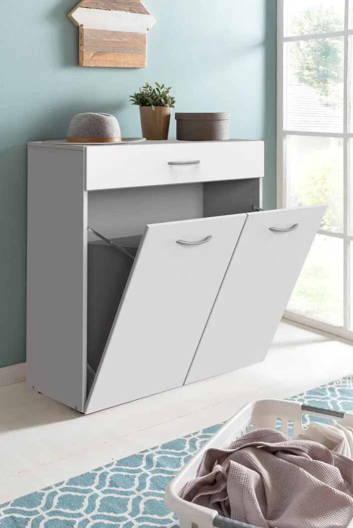 Die Kommode besteht aus einer robusten Holznachbildung und zeigt sich mit einer klaren, minimalistischen Formgebung. Die leicht geschwungen Griffe in der Farbe Grau runden das dezente Design gekonnt ab. Der untere Teil der Kommode besteht aus zwei Klapptüren. Dahinter können Sie Ihre Schmutzwäsche verstauen. Darüber befindet sich ein großer Schubkasten, der beispielsweise Platz für Waschmittel oder Kosmetikartikel bietet. Aufgrund des dezenten Designs harmoniert die Kommode mit zahlreichen Einrichtungsstilen. Außerdem ist sie herrlich zeitlos und kann so über viele Jahre genutzt werden.