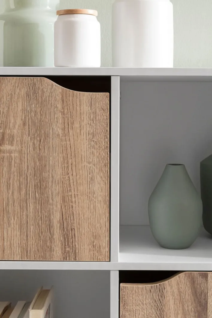 Die Kommode ist 89 cm breit, 91 cm hoch sowie 29 cm breit. Sie ist eine gelungene Kombination aus vier offenen und fünf mit Drehtür versehenen Fächern. Der Korpus ist in Weiß gehalten, die Drehtüren in einem helleren Braunton.