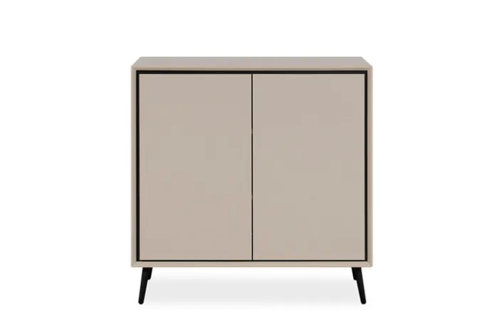 Die Hauptfarbe Beige, kombiniert mit schwarzen Akzenten, verleiht der Kommode eine elegante und zeitlose Optik. Die sandfarbene Oberfläche ist melaminbeschichtet, was für eine pflegeleichte und langlebige Nutzung sorgt.
