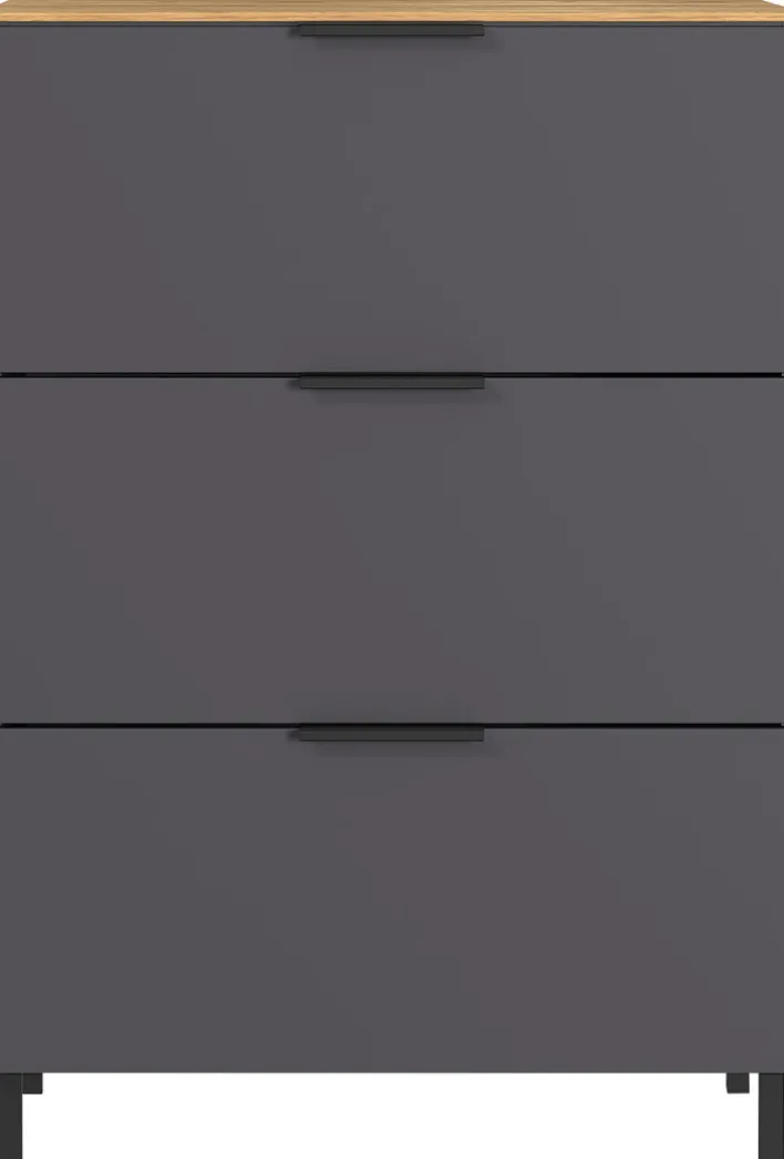 Die Kommode CALIFORNIA besteht aus hochwertiger Holznachbildung und kombiniert den grauen Korpus mit einer braun abgesetzten Deckplatte und schwarz pulverbeschichteten Metallfüßen. Mit ihrem modernen Look verleiht sie jedem Wohnraum ein stylisches Ambiente. Um die Strapazierfähigkeit der Oberflächen zu erhöhen, sind diese zusätzlich mit Melaminharz beschichtet. In den drei Schubkästen mit Selbsteinzug bietet die Kommode jede Menge Platz für Alltagsgegenstände.