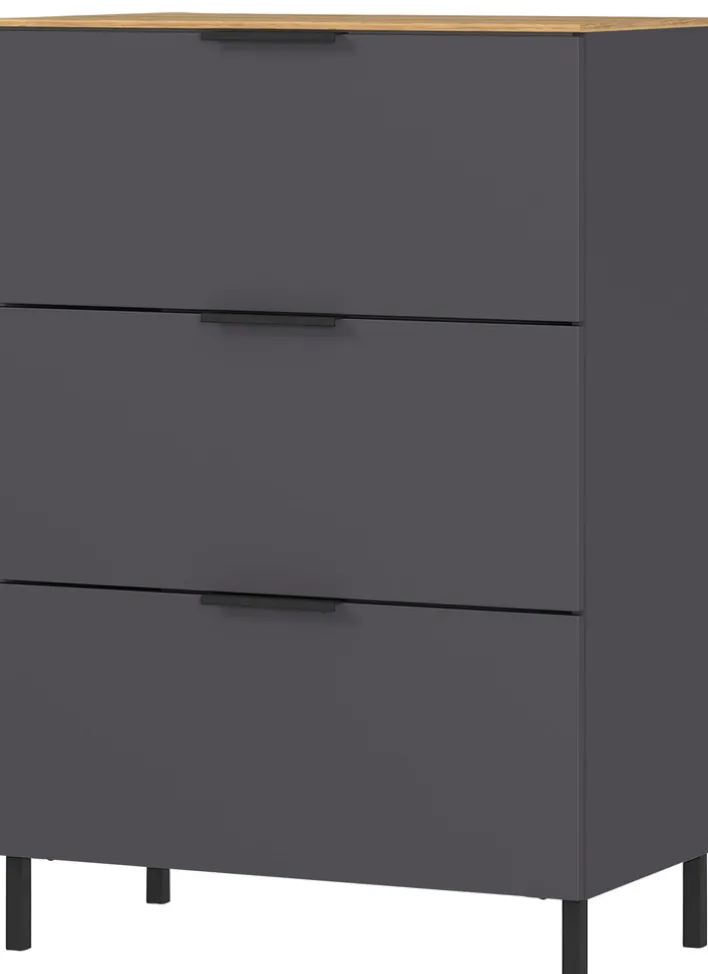 Top modern und wunderbar schlicht präsentiert sich die 68 x 98 cm große Kommode CALIFORNIA in der Farbkombination Graphit/ Navarra-Eiche. Neben der ansprechenden Optik bietet sie viel Stauraum bei möglichst wenig Platzbedarf und ist dadurch eine Bereicherung für viele Wohnräume.