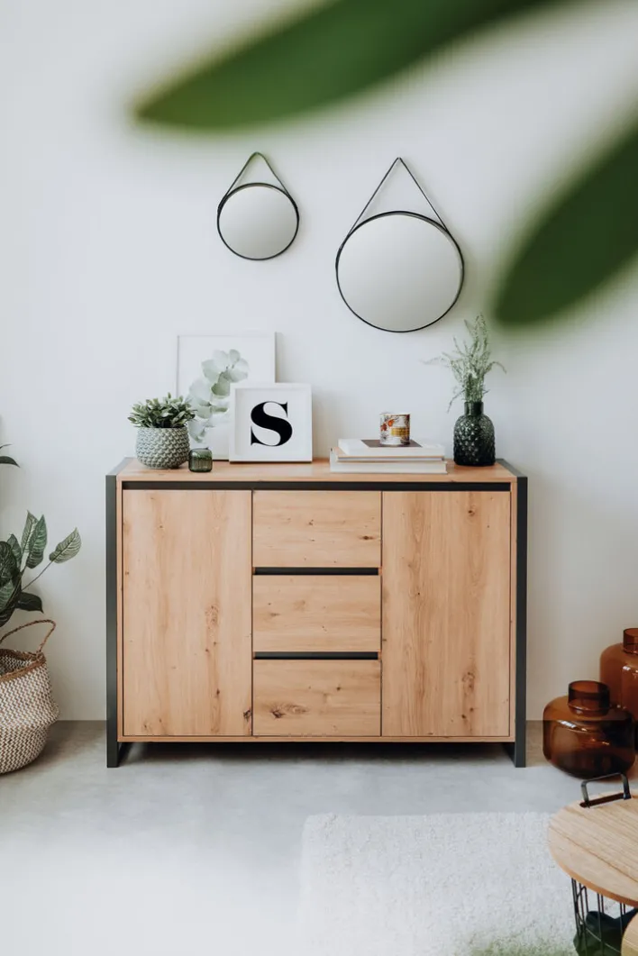 Die Kommode DENVER trägt in jedem Raum zu einem wohnlichen Ambiente bei. Sie ist aus einer Holznachbildung in Artisan Oak Optik gefertigt. Der Rahmen und die Griffleisten mit Absetzungen im Farbton Anthrazit bilden einen gelungenen Kontrast. Der Schrank verfügt über 2 Drehtüren mit Fächern dahinter und 3 Schubkästen. Viele Dinge lassen sich hier unsichtbar unterbringen. Auf der Oberplatte ist Platz für Deko, eine Lampe, Bilder oder Pflanzen.