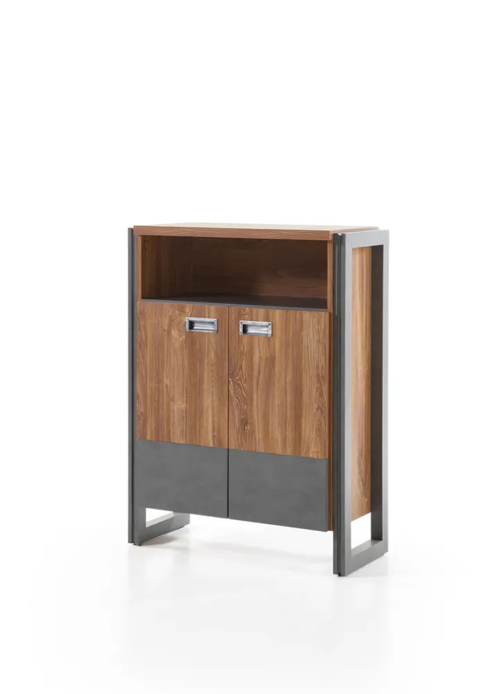 Die 75 x 100 cm große DETROIT Kommode in Braun/Anthrazit macht sich zwei zeitlose Evergreens der Inneneinrichtung zu Nutze: Einerseits die ikonische Farbkombination, die schon den Midcentury-Stil bestimmte, andererseits die symmetrische Form mit eingebetteten Griffelementen. Die offene Ablagefläche könnte zum Beispiel für Bücher, Magazine oder Deko-Elemente genutzt werden.